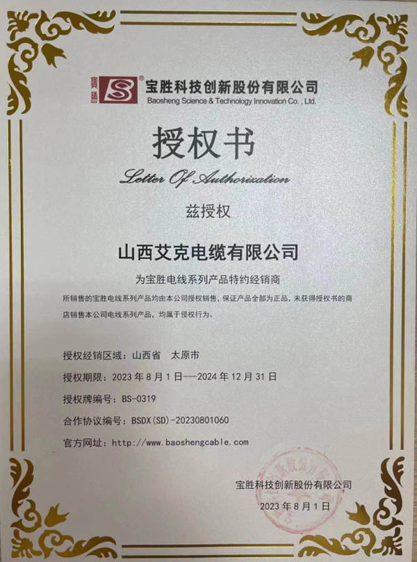 寶勝電纜山西銷售中心山西艾克電纜有限公司是寶勝電線電纜的官方授權經銷商,授權編號BS-0319。專業經營寶勝牌電線電纜,包括電力電纜,控制電纜,橡套電纜;硅橡膠電纜,氟塑料電纜,補償電纜,各種阻燃,低煙無鹵,耐火,及高溫電線電纜;架空絕緣電纜,船用電纜,礦用電纜,機車車輛電纜,計算機電纜,儀表信號電纜,高壓交聯電力電纜,低壓輻照交聯電力電纜,低壓輻射交聯控制電纜,低壓輻照交聯電纜,預分支電纜,1E級K3類核電站電纜,承荷電纜,自控溫電纜,布電纜,鋁絞線,和鋼芯鋁絞線等電線電纜產品。產品備有大量現貨、各種型號顏色齊全、支持配送。